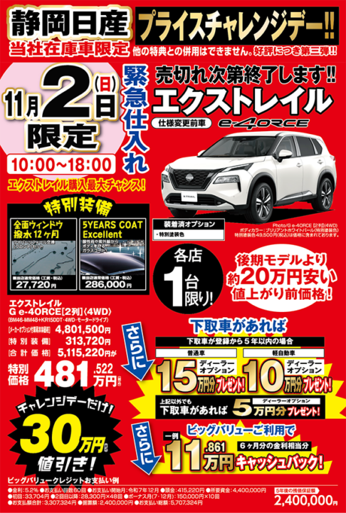 ☆エクストレイル☆ 2025/11/02 | 焼津道原店 ツイート こんにちは 焼津道原店です 11月2日(日)は、静岡日産 プレイスチャレンジデー 本日はエクストレイルになります 詳しくは店舗までご連絡ください。 皆様のご来店をお待ちしています 焼津道原店 054-624-1358 前の記事へ 次の記事へ